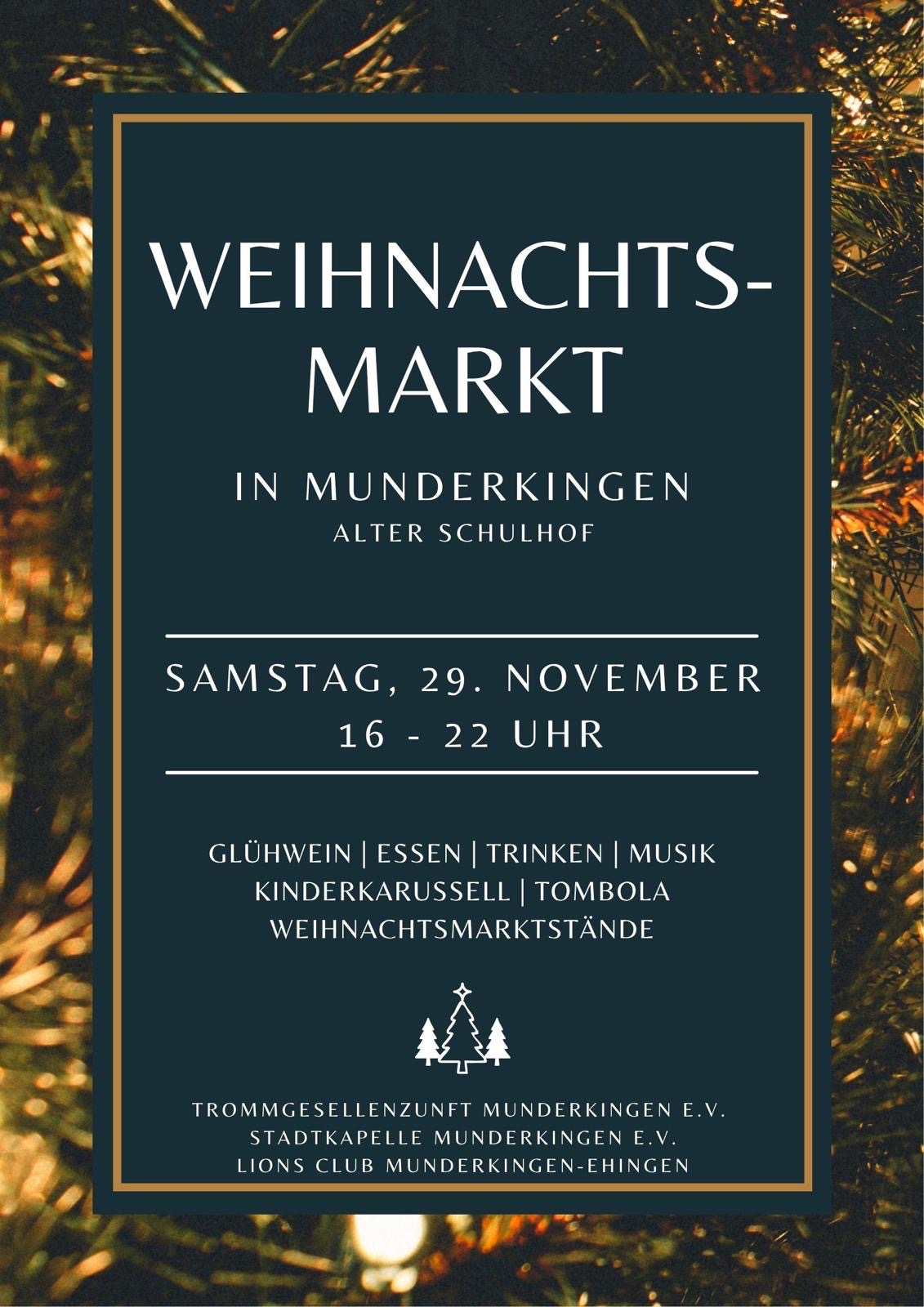 Der Weihnachtsmarkt in Munderkingen findet in diesem Jahr am Samstag, den 29. November 2025 im Alten Schulhof statt, eine gemeinsame Veranstaltung der Stadtkapelle Munderkingen e.V. und der Trommgesellenzunft Munderkingen e.V.