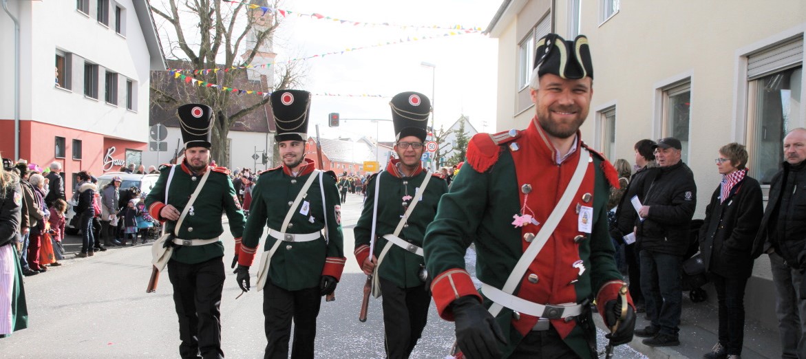 Als dann 2018 die seit Jahrzehnten verschollene Torwache wieder zum Leben erweckt wurde, war die Narrenzunft sehr froh darüber. Fünf Männer sind in die grünen Uniformen geschlüpft und haben sich den schwarzen hohen Tschako mit seiner zylindrischen Form aufgesetzt,